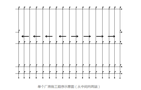 對于同一個廠房,鋼構(gòu)件安裝順序采用以“減少誤差,從中間向兩端”的方法進(jìn)行安裝。