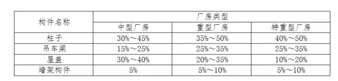 各種構(gòu)件的用鋼量占整個廠房鋼結(jié)構(gòu)的總用鋼量的比值大致如表所示。