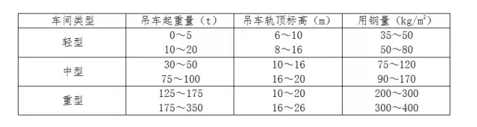 廠房按單位面積計算的用鋼量,是評定設(shè)計的經(jīng)濟合理性的一項重要指標。各類廠房單位面積用鋼量的統(tǒng)計數(shù)值見下表
