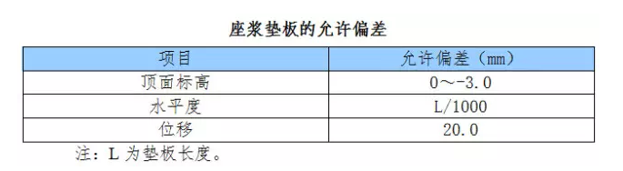 b. 宜根據(jù)測得的柱底面至牛腿距離決定每個基礎(chǔ)墊板的頂面標高,座漿墊板的標高、水平度和定位的允許偏差應(yīng)符合下表的規(guī)定。