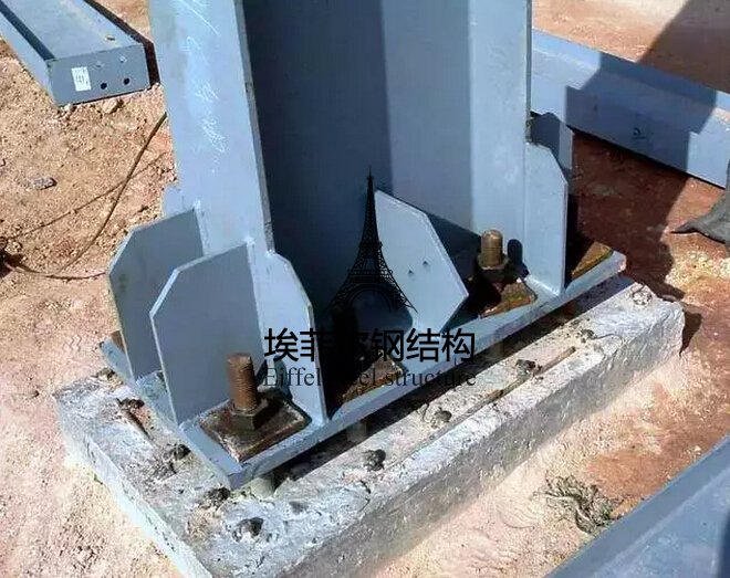 鋼柱宜采用一點直吊綁扎法起吊,就位時對準地腳螺栓緩慢下落,對位后擰上螺帽將柱臨時固定,校正其平面位置和垂直度;校正后終擰螺帽,用墊板與柱底板焊牢,然后柱底灌漿固定 。