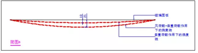 大家通過“簡圖a”(玻璃面板為水平,無任何坡度)可以看到,玻璃跨度為2*1.5m(1.5m定義為短邊,且平行于截面方向),在風荷載及重力荷載共同作用下,它的擾度限值為1.5*L/60=25mm,在玻璃自重作用下,它的擾度值是10mm,那么按此設計是合乎計算要求的,那么我們是否就可以說這樣就沒有問題呢,顯然這是有問題的。