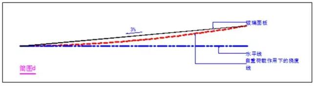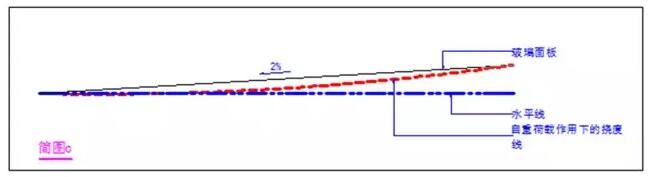 那么我們把坡度調整為2%呢,請大家看“簡圖c”,此時,水坑的底部基本與水平線相切,相對于水平面的凹陷現(xiàn)象基本消失,但是筆者卻也同時發(fā)現(xiàn),在實際中,按此方法設計的雨棚,還是會有少量的積水積灰現(xiàn)象的發(fā)生,這種現(xiàn)象筆者初步分析為施工上的少許誤差或支撐桿件所受永久荷載的變形所造成,那么我們就還有必要通過技術手段來解決此問題。