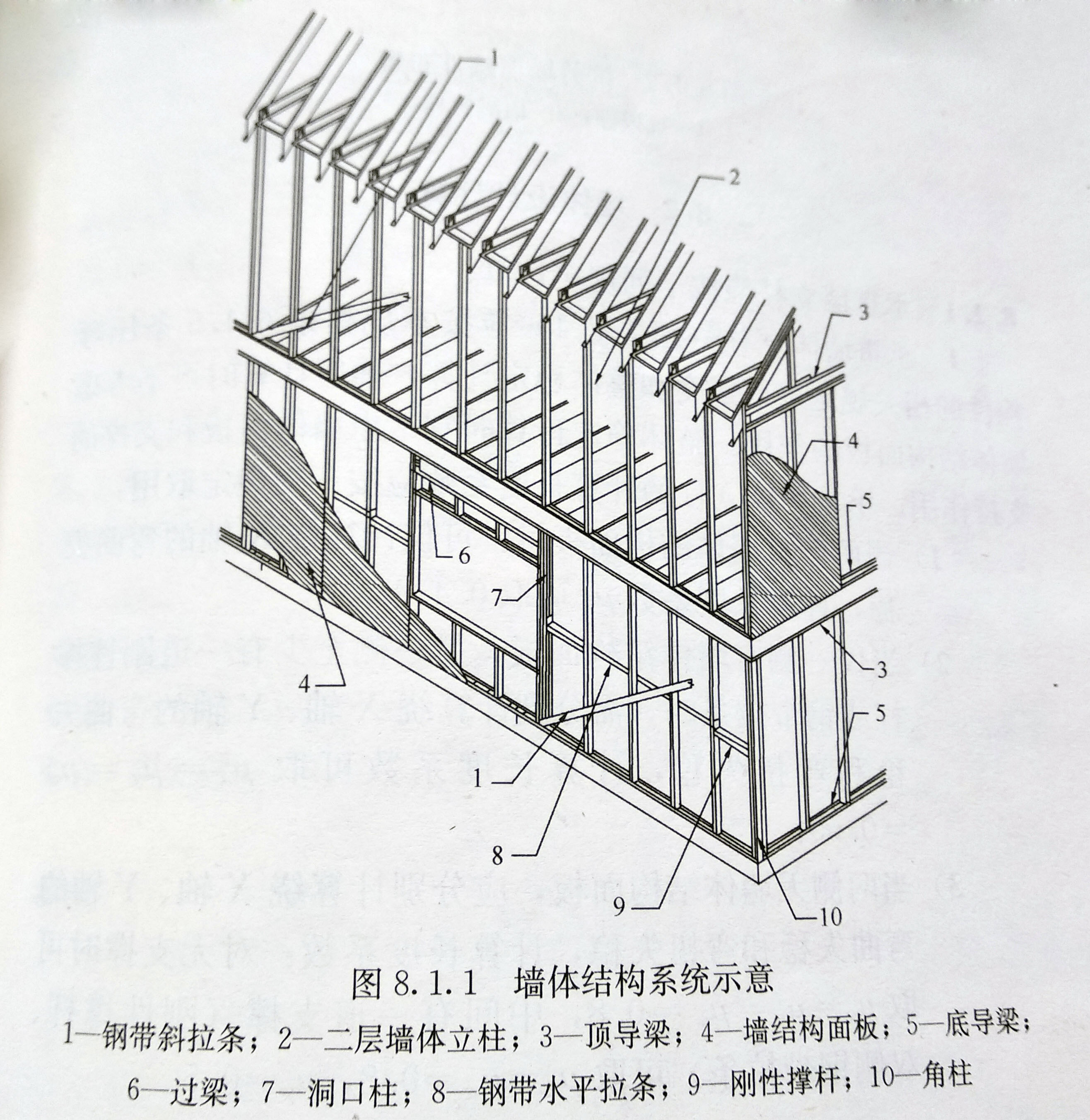 1、低層冷彎薄壁型鋼房屋墻體結(jié)構(gòu)的承重墻應(yīng)有立柱、頂導(dǎo)梁和底導(dǎo)梁、支撐、拉條和撐桿。墻體結(jié)構(gòu)面板等部件組成(圖1)。非承重墻可不設(shè)置支撐、拉條和撐桿。 墻體立柱的間距宜為400mm到600mm。