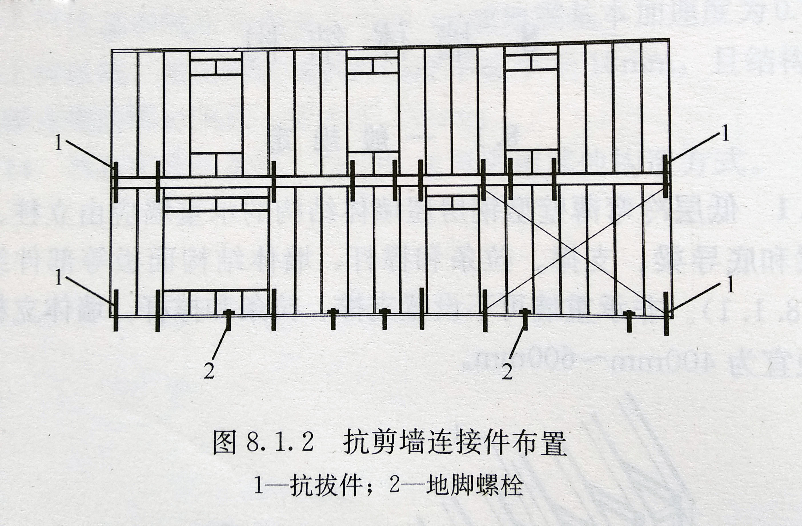 2、低層冷彎薄壁型鋼房屋結(jié)構(gòu)的抗剪墻體,在上、下墻體間應(yīng)設(shè)置抗拔件,與基礎(chǔ)間應(yīng)設(shè)置地腳螺栓和抗拔件(圖2)。