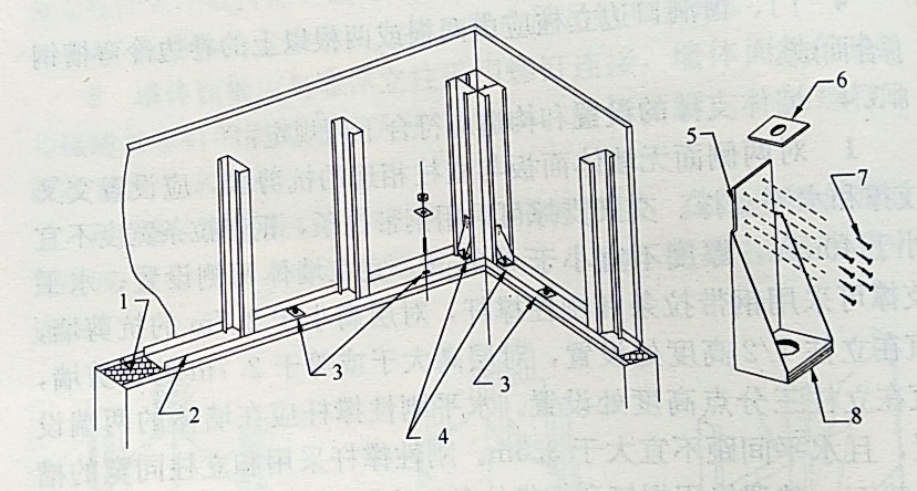 1-防腐防潮墊層;2-底導(dǎo)梁;3-地腳螺栓;4-抗拔螺栓及抗拔連接件;5-立板;6-墊片;7-螺釘;8-底板