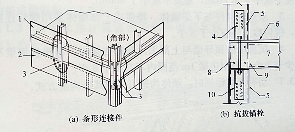 1-連接螺釘;2-剛性撐桿;3-鋼帶;4-墻面板;5-墻體立柱;6-頂導(dǎo)梁;7-底導(dǎo)梁;8-抗拔螺栓