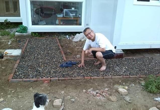 骨架搭建起來后,大叔需要做一定的美化和改善,比如搭建露臺、修筑小路以及培育花草等等,大叔忙得不亦樂乎,像這個就是他在用紅磚修筑小路。