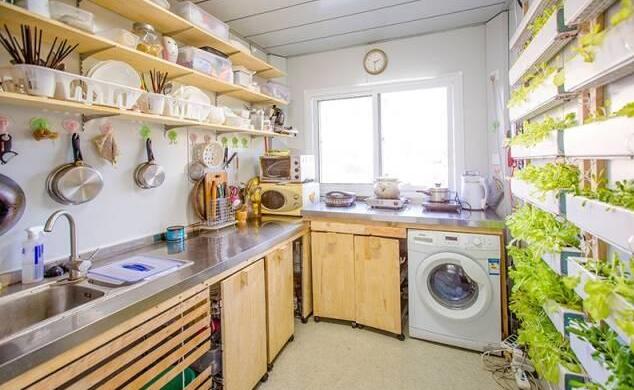 廚房效果,整體還是很實用的,收納空間很大,洗衣機(jī)也塞到了這里。右邊是培育蔬菜的管道。