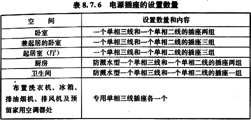 8.7.6 住宅套內(nèi)電源插座應(yīng)根據(jù)住宅套內(nèi)空間和家用電器設(shè)置,電源插座的數(shù)量不應(yīng)少于表8.7.6的規(guī)定。
